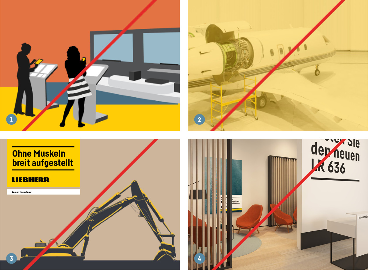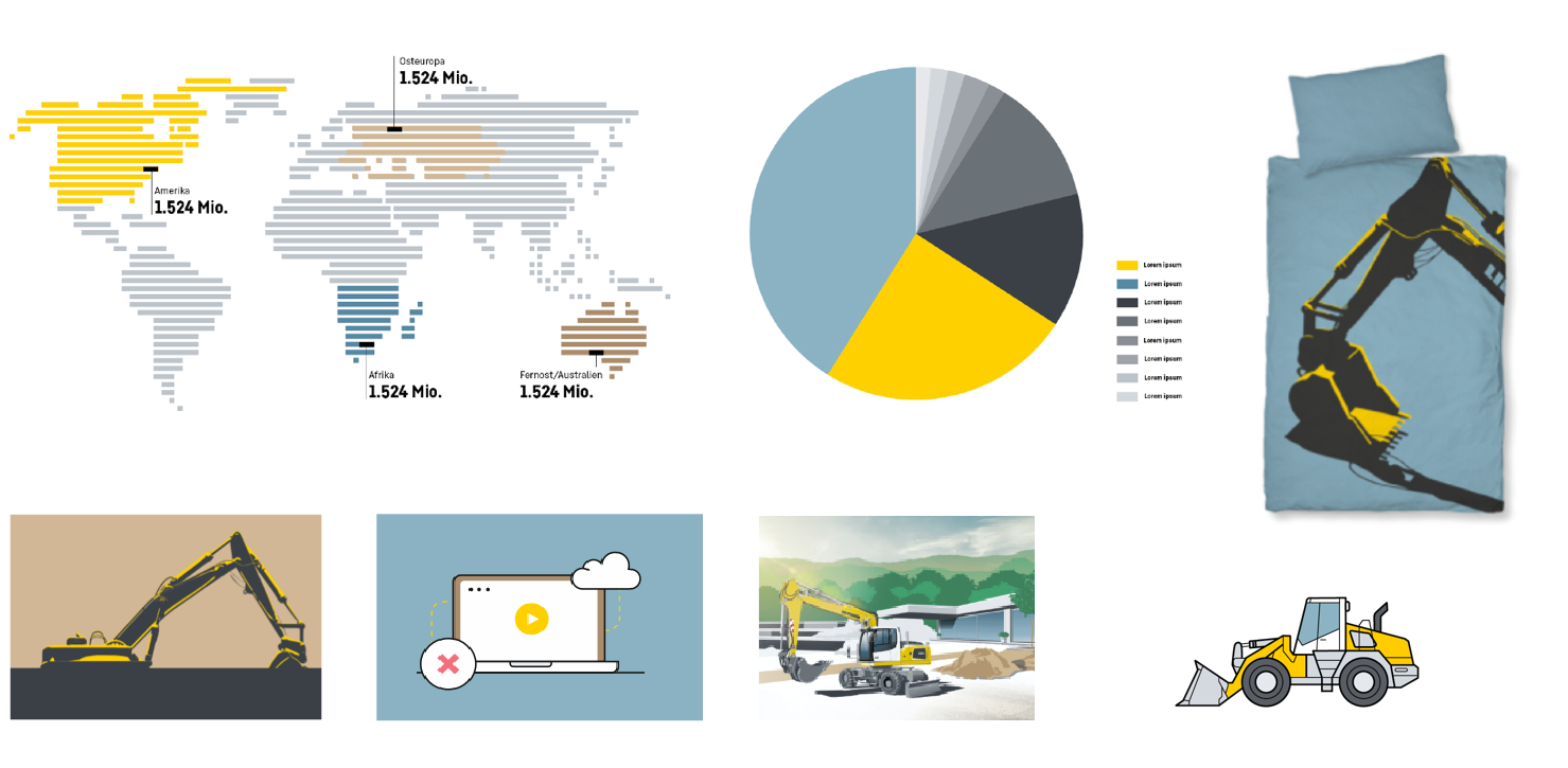 Die folgenden Darstellungen zeigen stimmige farbliche Gewichtungen und Verhältnisse sowie ein gelungenes Zusammenspiel der Liebherr-Farben auf: