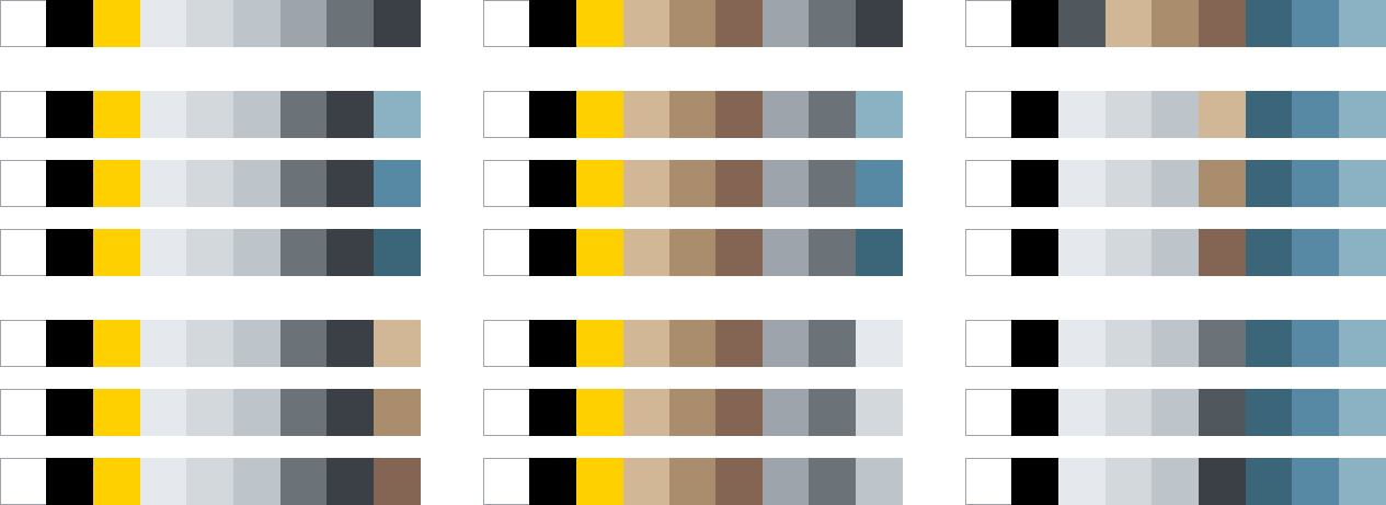 Bei der Verwendung von mehreren Sekundärfarben sind die empfohlenen Kombinationen zu beachten. Neben den Liebherr-Steel-Tönen sind besonders Slate und Terra dazu geeignet, den Markencharakter zum Ausdruck zu bringen. Sie können mit oder ohne Liebherr Yellow verwendet werden.