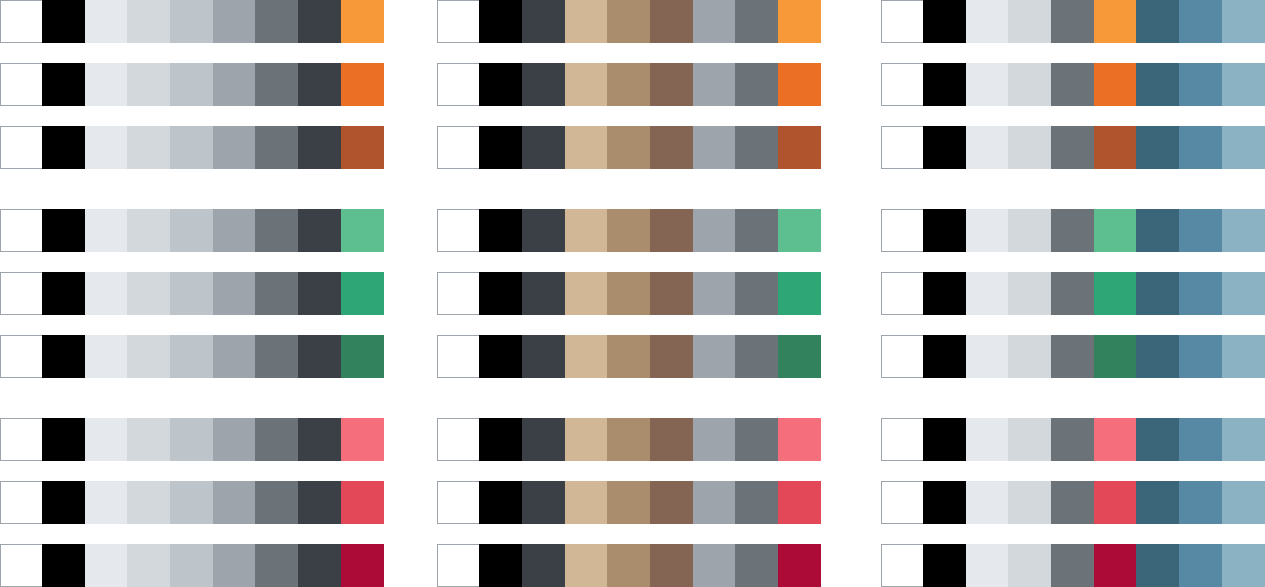 Clay, Leaf und Ruby finden nur thematisch oder anwendungsspezifisch Verwendung. Es wird empfohlen, diese Töne nur mit Terra, Slate Black oder den Steel-Tönen zu kombinieren.