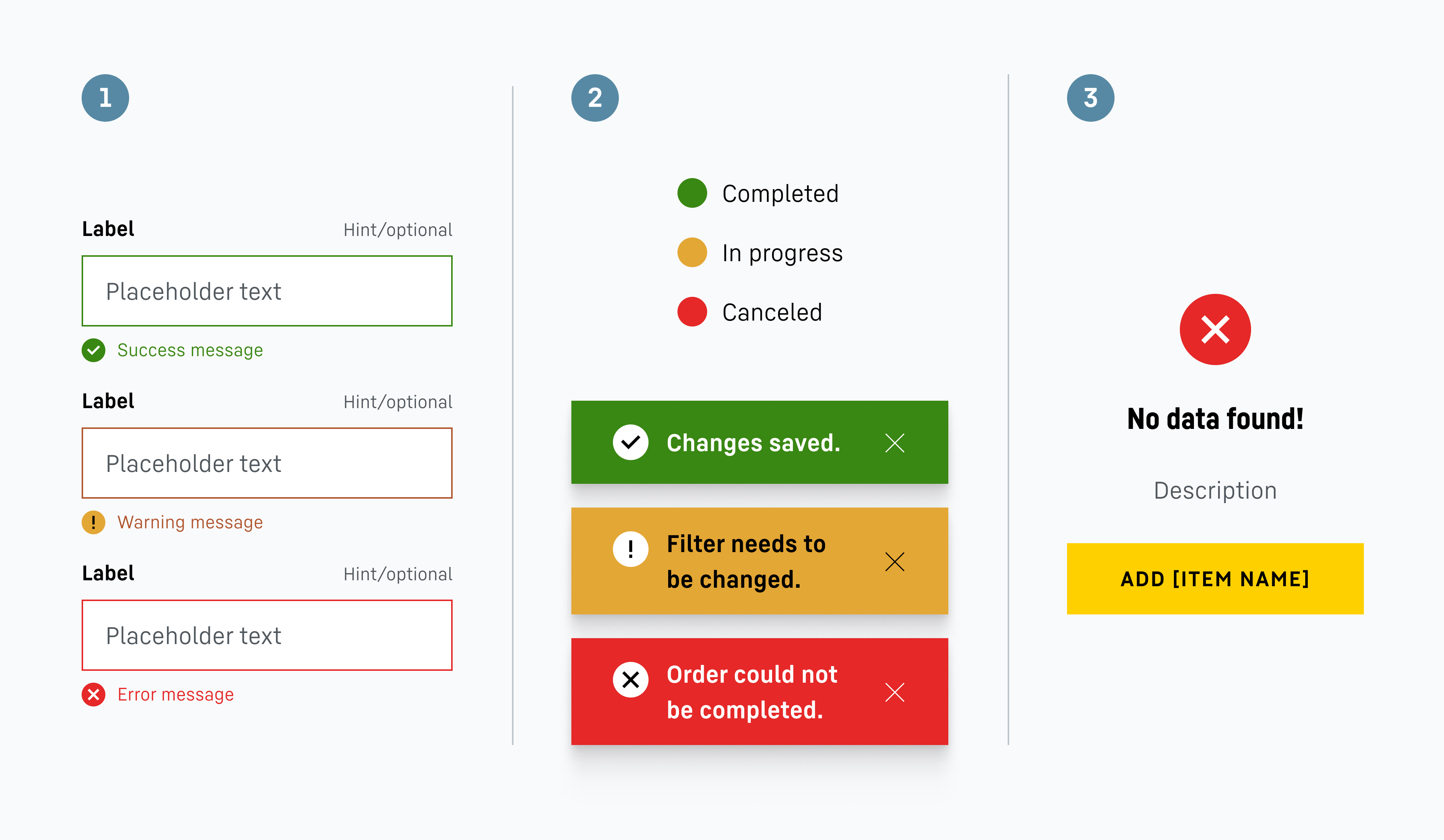 3 Funktionsfarben werden bei den Funktionsicons eingesetzt. Diese sind oft Teil eines System-Feedbacks, das dem Nutzer auf einen Blick zeigt, ob z.B. eine Aktion erforderlich ist.