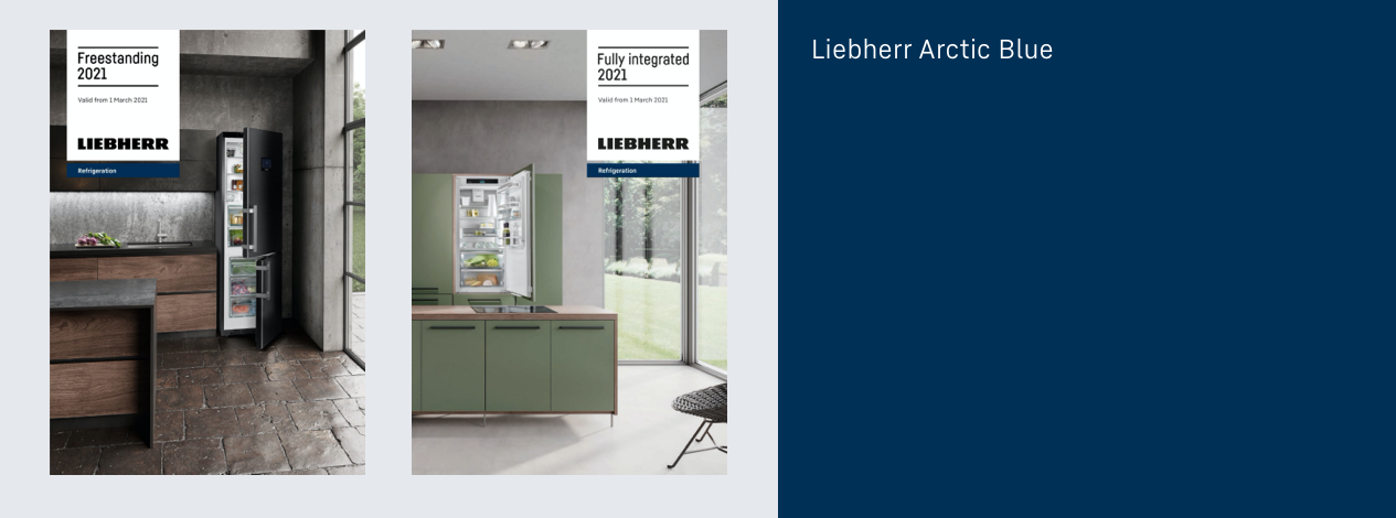 Für Liebherr-Hausgeräte wurde eine separate Farbpalette entwickelt, die nur für diese Sparte gilt. Wichtigster Unterschied: Statt Liebherr Yellow wird Liebherr Arctic Blue als primäre Markenfarbe verwendet. Daneben existieren auch weitere Hausgeräte-eigene Sekundärfarben.